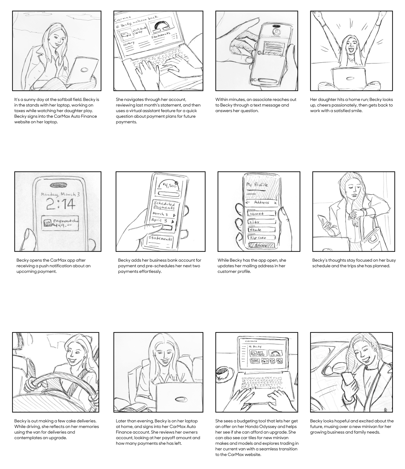 To ensure that both sides of the business were strategically aligned on direction, I developed a series of hand-drawn UX storyboards to clearly communicate the vision for the new website. By visualizing real-world customer scenarios, I was able to gather focused executive feedback early—before investing significant time in iterating and refining Figma designs. What was most important to me was that the story we were crafting for our customers was clear.
